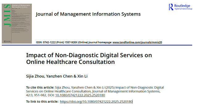 近期,h片 电子商务系周思佳老师与合作者在FT50期刊《Journal of Management Information Systems》在线发表学术论文“Impact of Non-Diagnostic Digital Services on Online Healthcare Consultation”。