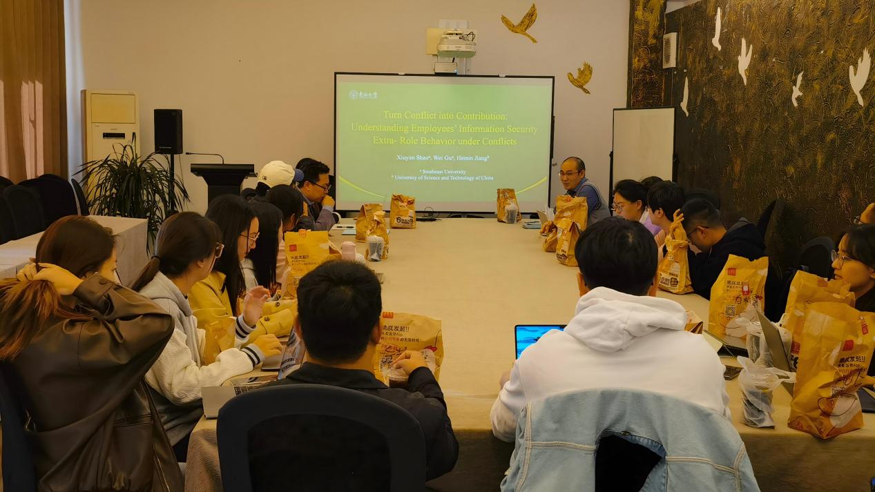 随后,邵老师以“Turn Conflict into Contribution: Understanding Employees’ Information Security Extra-Role Behavior under Conflicts”为主题,系统介绍了其团队在信息安全行为领域的最新研究成果。她指出,信息安全管理中常出现“安全-效率”两难困境,而传统研究多聚焦于员工的合规行为,忽略了其在安全实践中的主动贡献。邵老师从“任务型”与“角色型”两类信息安全冲突切入,基于交易压力理论,构建了一个包含认知评估与应对行为的理论模型,揭示了自我效能感在冲突认知与行为选择中的关键调节作用。研究通过情景实验与结构方程建模,验证了“工作塑造”作为建设性应对方式对员工信息安全额外角色行为的促进作用,为组织在制度设计、培训支持与身份整合等方面提供了实践启示。